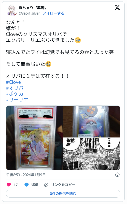 43万円もあれば、もっと当たり確率の高い高額オリパや総口数の少ないオリパを選ぶべきだったと推測できます。炎上事件の後も、cloveオリパでは多数の当選報告が続いています。