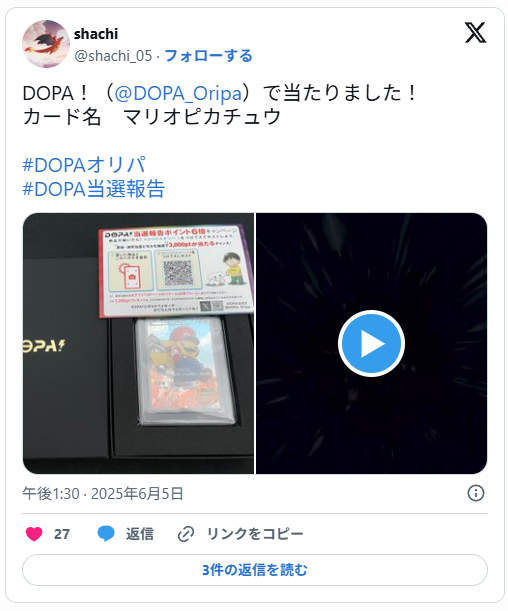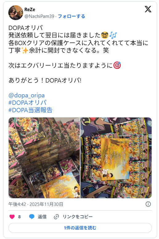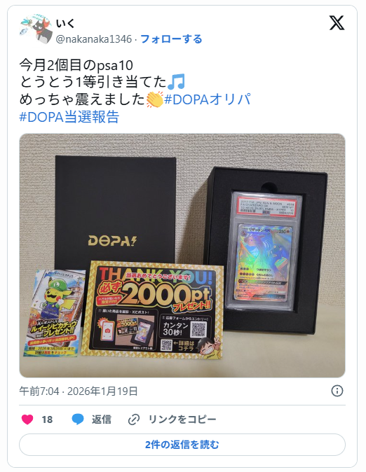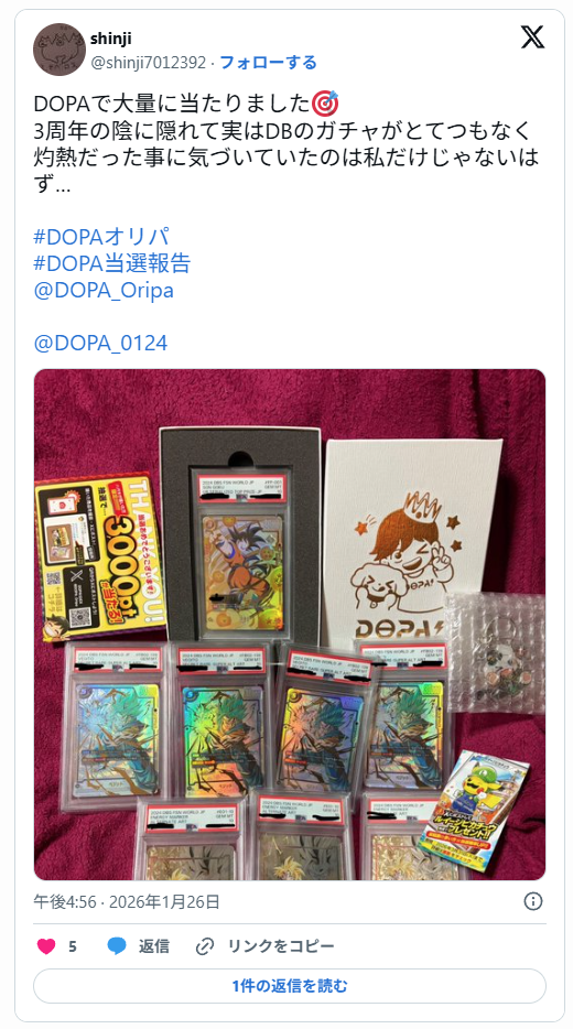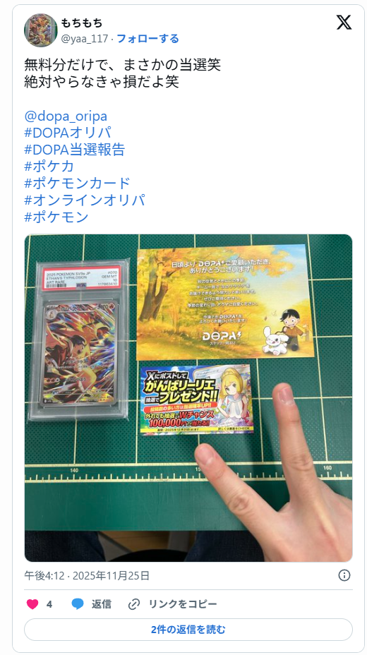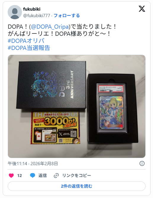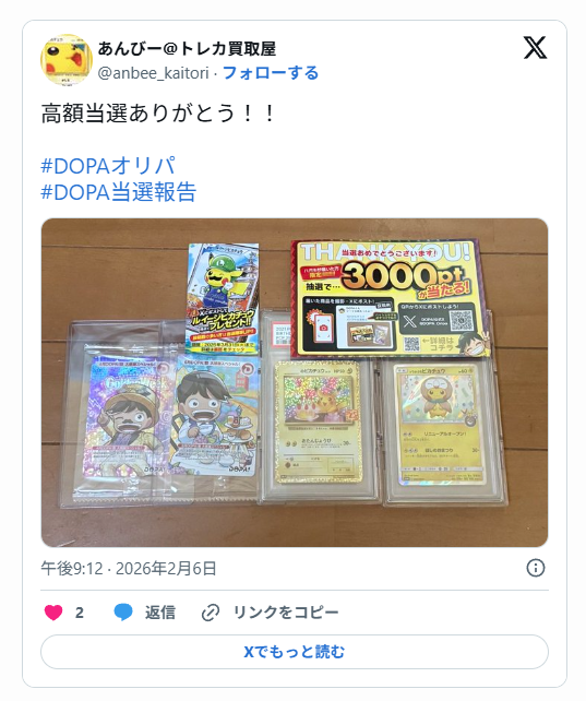 DOPAオリパの公式Xでは、定期的にプレゼント企画が実施されています。