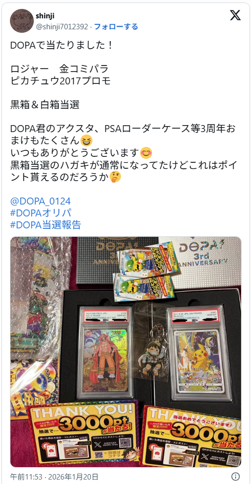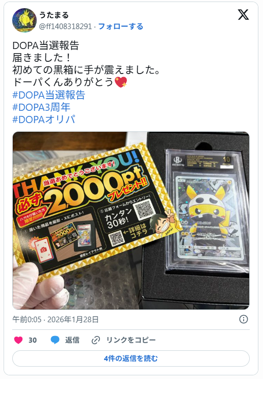 DOPAは高額当選報告数が圧倒的に多く、当選してXに投稿するとポイントが貰えます!