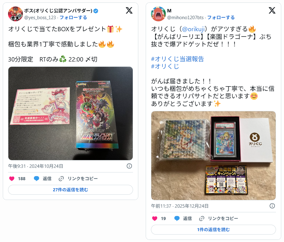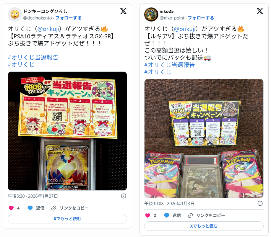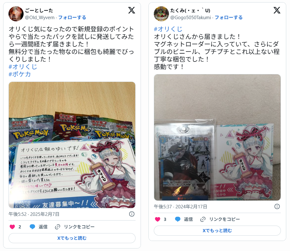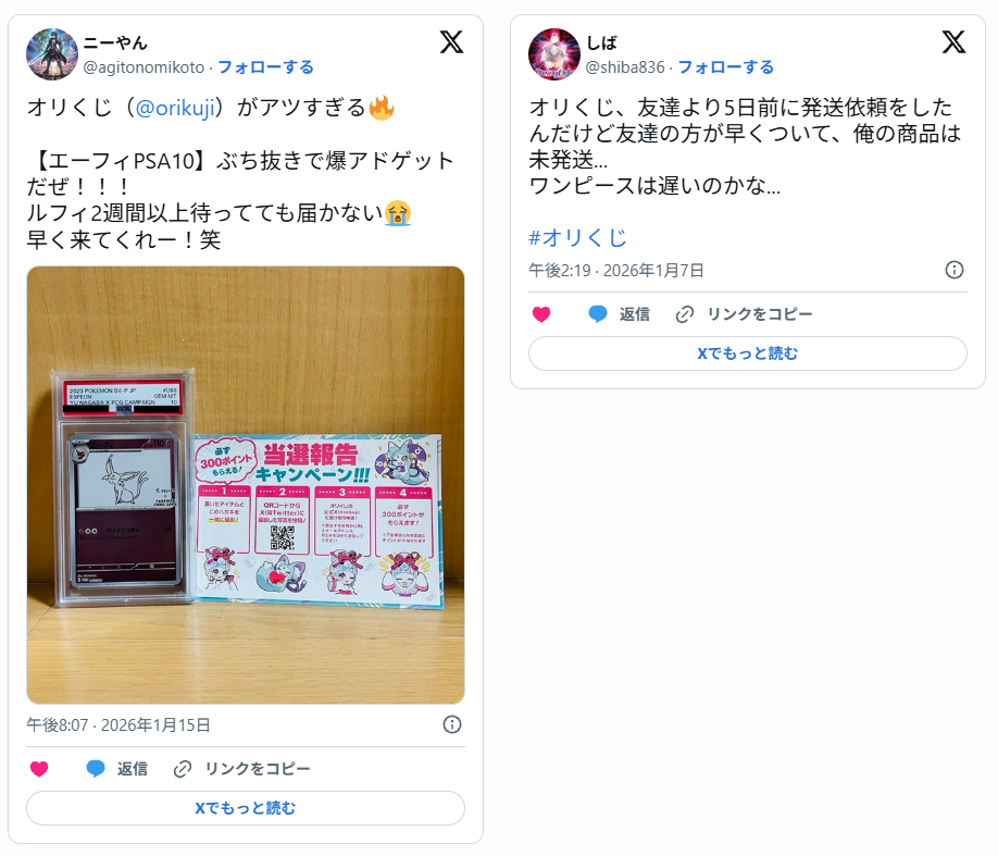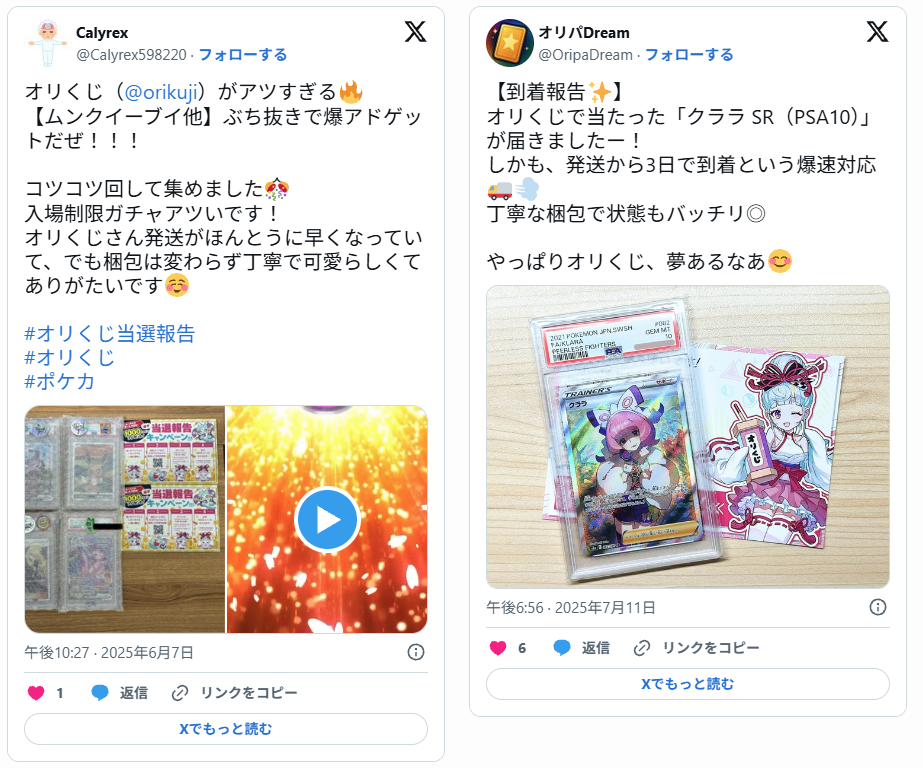 X(旧Twitter)で「#オリくじ」「#オリくじ当選報告」などのハッシュタグを検索すると、実際にカードが届いた写真付きの投稿が、数多く投稿されています。