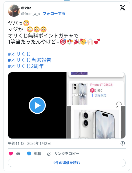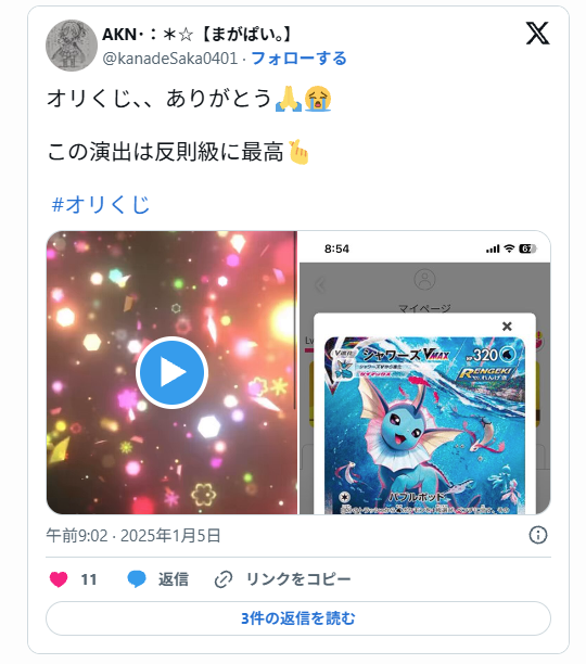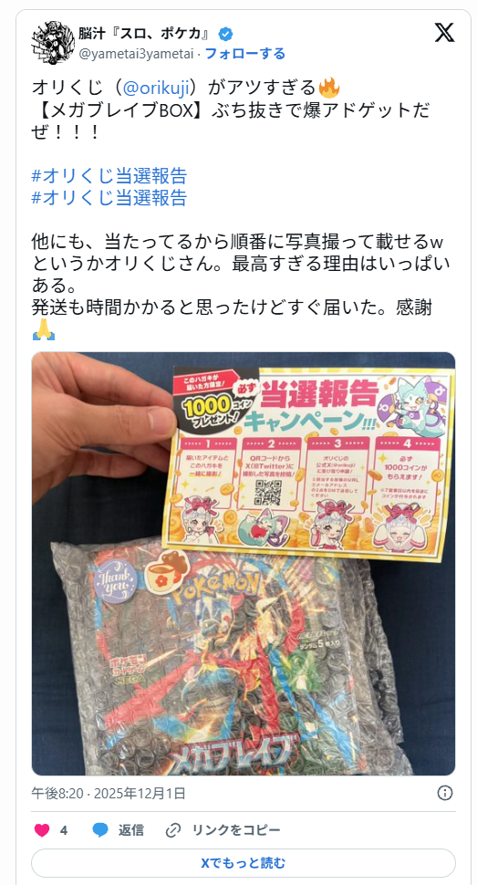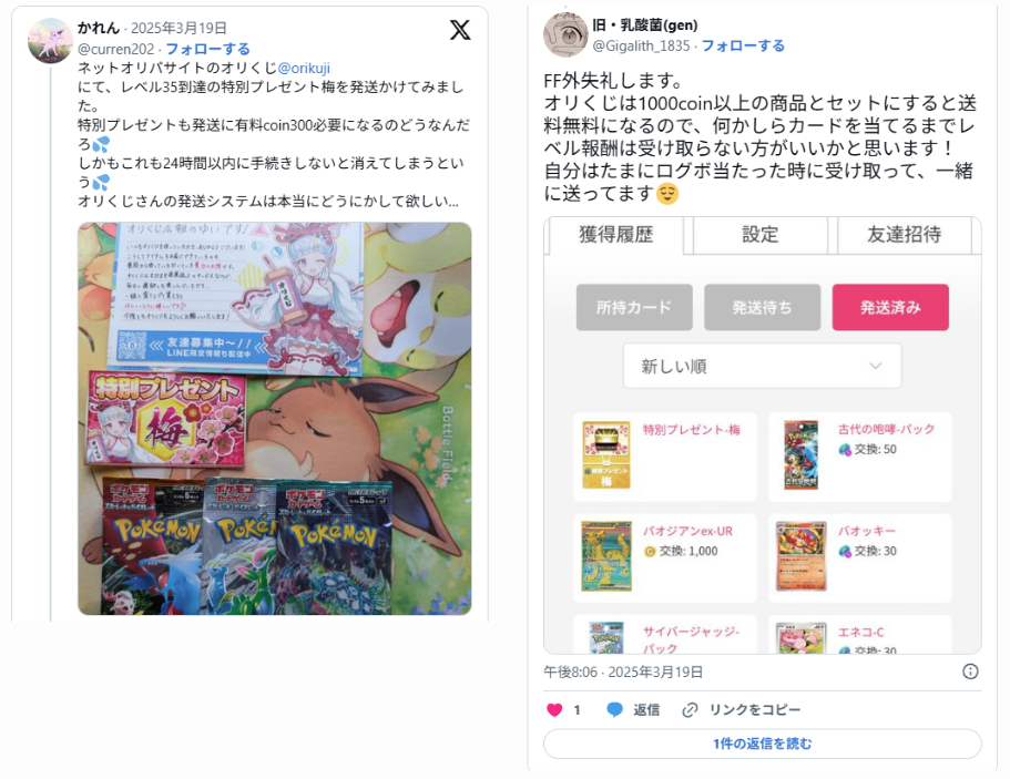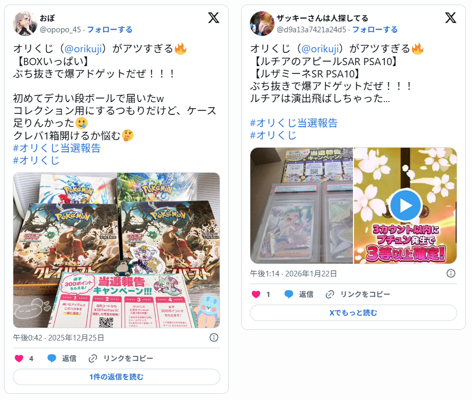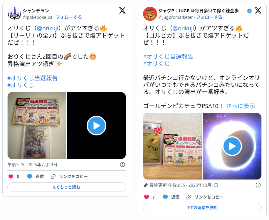 X(旧Twitter)で「#オリくじ」「#オリくじ当選報告」などのハッシュタグを検索すると、実際にカードが届いた写真付きの投稿が、数多く投稿されています。