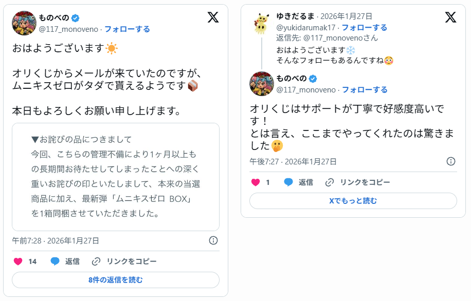 オリくじ(オリパくじ)は、運営会社の情報が公開されており、サポート対応が丁寧だったという声も見られます。SNS上では当選報告や到着報告も確認できるため、極端に不安になる必要はないでしょう。