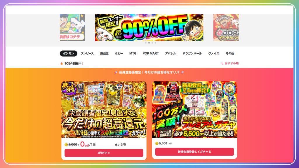 さらに、低価格帯で軽く試す使い方から、高額カードを狙う勝負寄りの遊び方まで選択肢が広く、気分や予算で調整しやすいのも魅力です。