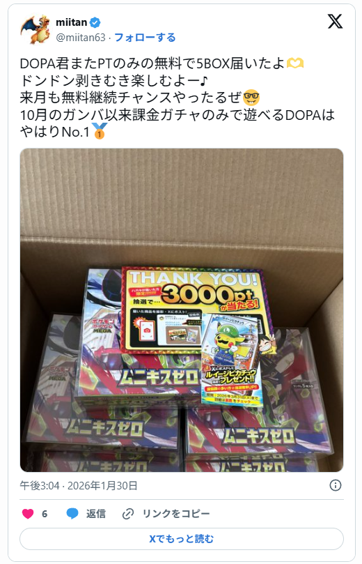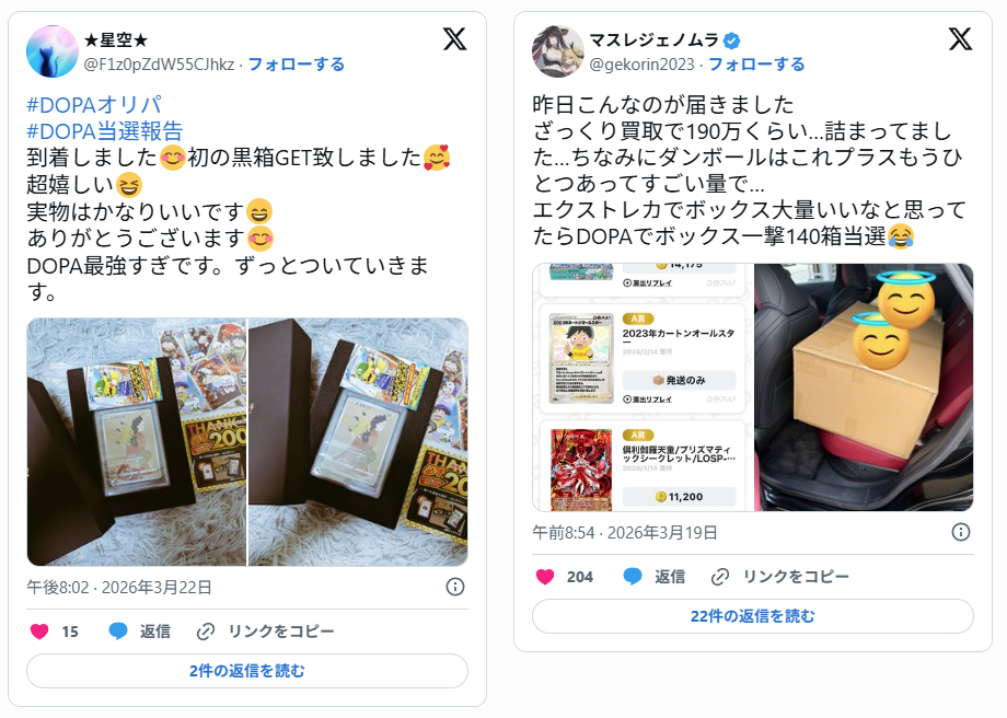 DOPAの当選報告数はNo.1です!当り報告5万件以上の実績があるので、安心です。ポケカBOXが無料ポイントで当たったり、カートン単位で当選する事もあります。