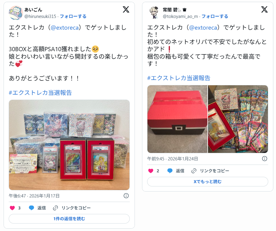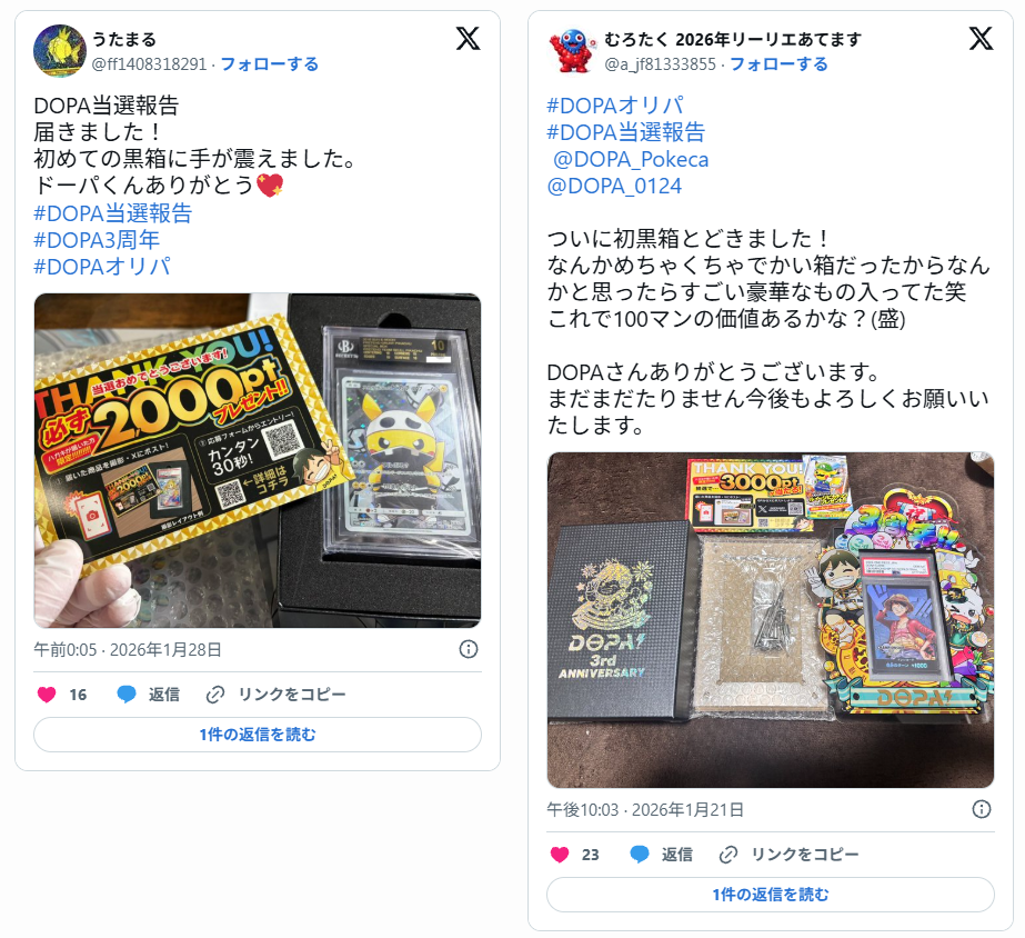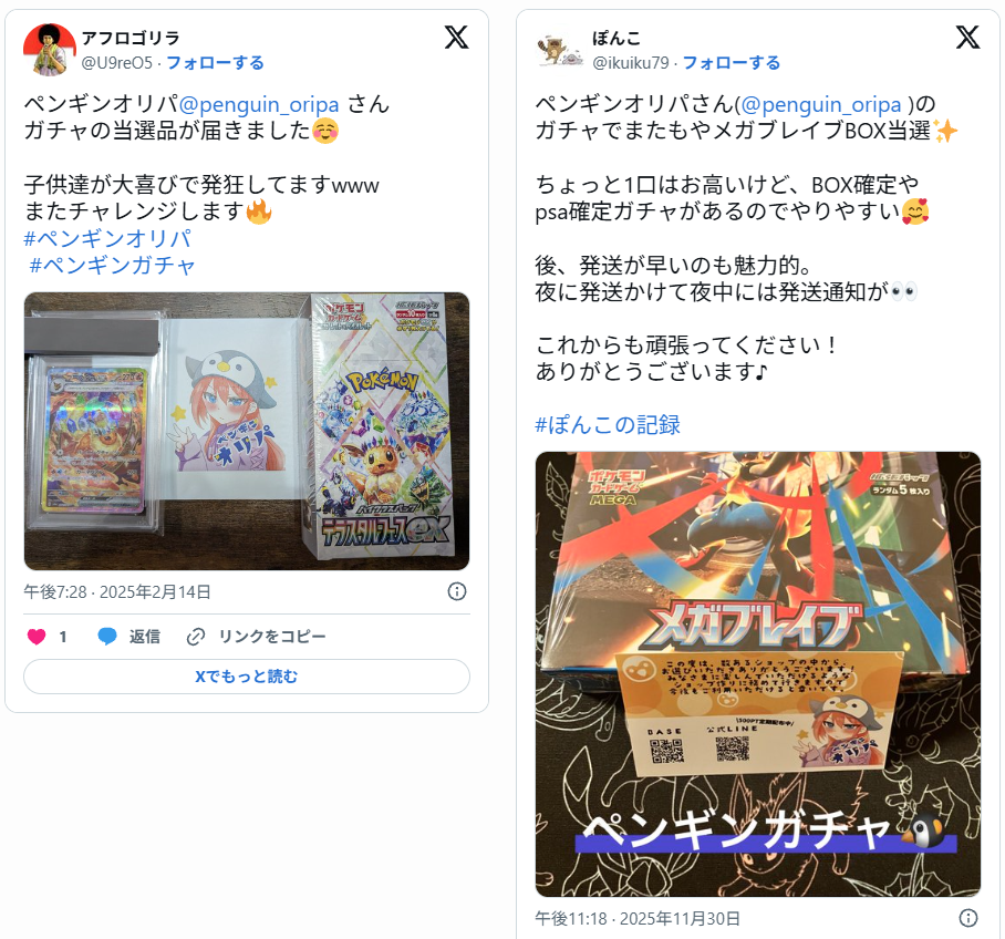 口コミでは「当たり報告が画像付きで出ていて信ぴょう性を感じた」「演出が楽しくて引く時間が盛り上がる」といった声が見られます。ほかにも「発送が早かった」「梱包が丁寧で状態が良かった」など対応面の評価もあります。