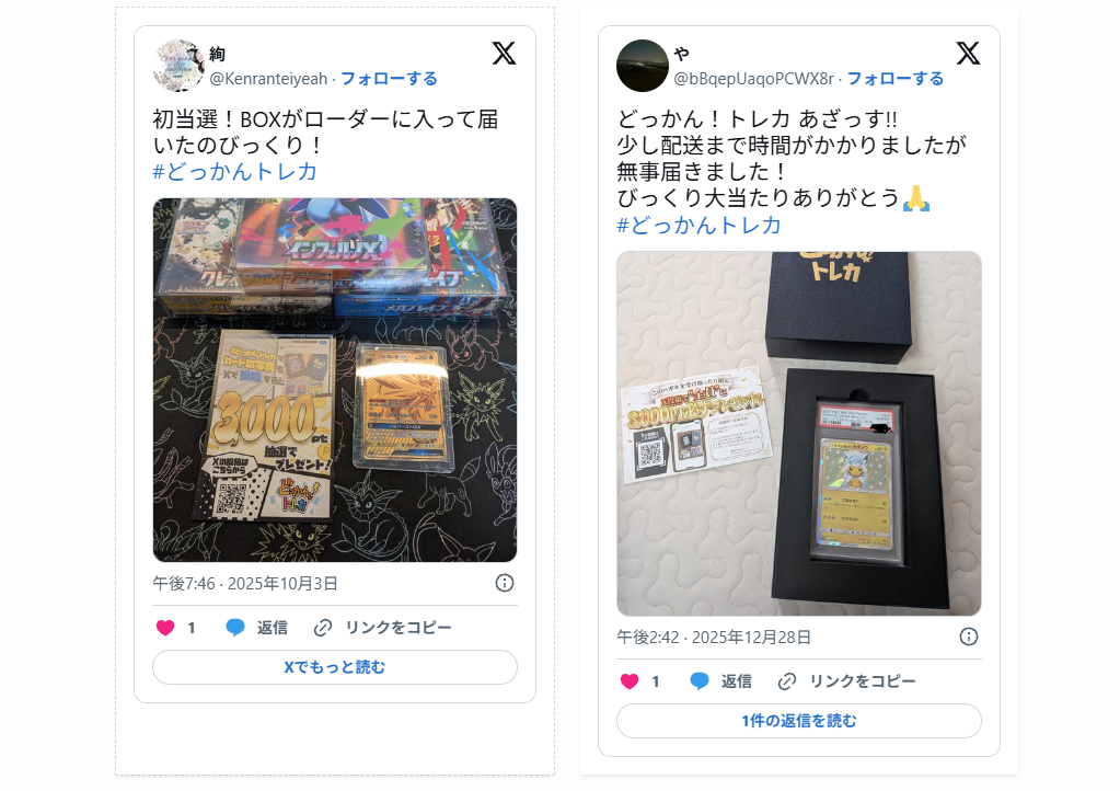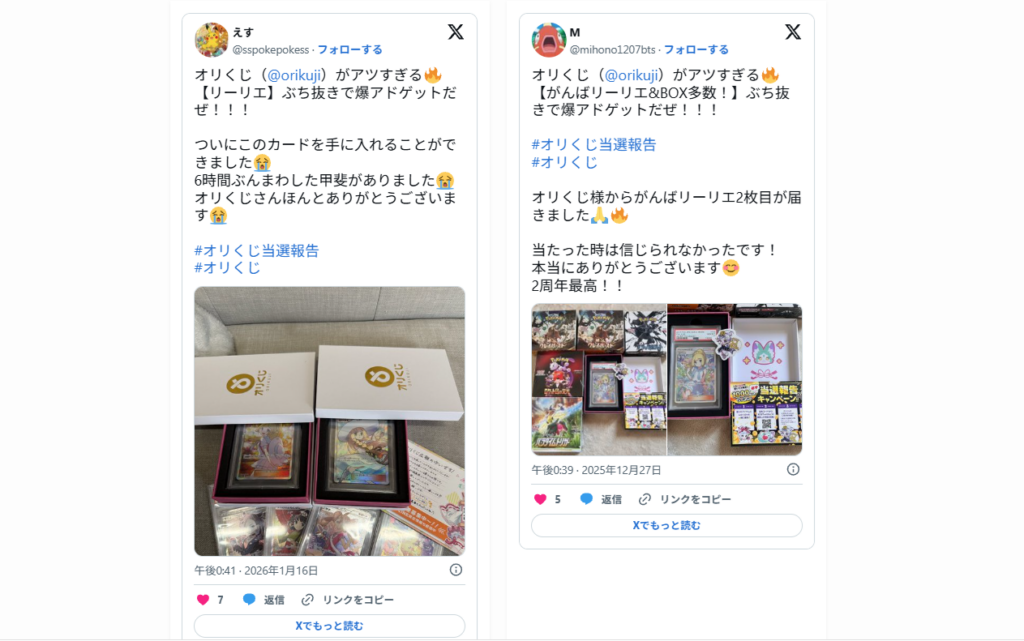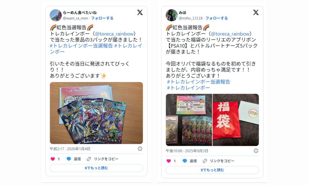 Xや動画では、写真付き・開封の流れが分かる投稿が見つかります。ただし、サイトによっては投稿にインセンティブ(ポイント付与など)があることもあり、その場合は当たり報告が目立ちやすくなる可能性があります。これは仕組みとして悪いとは限りませんが、体感を誤解しやすい点は注意です。