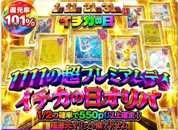 ICHICAオリパは、毎日1回限定のオリパで「購入ポイントが最低でもそのまま戻る」仕組みがあり、実質的に還元率100%を狙えるのが大きな魅力です。さらにランク(ブロンズ・シルバー・ゴールド)に応じた専用オリパも用意されていて、条件が合えば高還元寄りの設計を選びやすいです。検索・絞り込み機能も強く、作品タイトルや必要ポイント、1日1回枠、ランク限定などで探せるので、目的のオリパに最短でたどり着けます。加えて、実物のカードをめくるような演出でワクワク感が出るため、ガチャ体験そのものを楽しみたい人にも相性がいいです。運営は法人で、サービス開始(2023年10月)から継続運営されている点も判断材料になります。高額カードがラインナップされることもあり、当たりの夢も持てます。