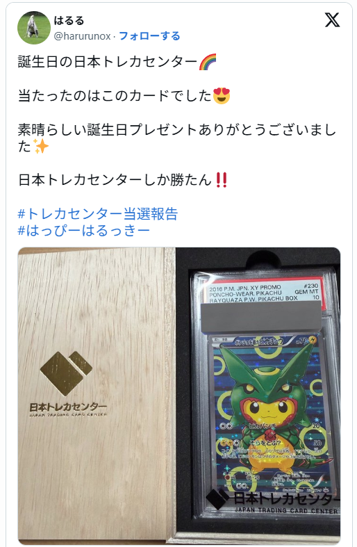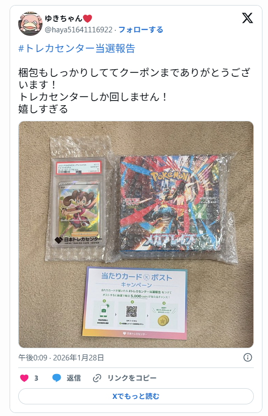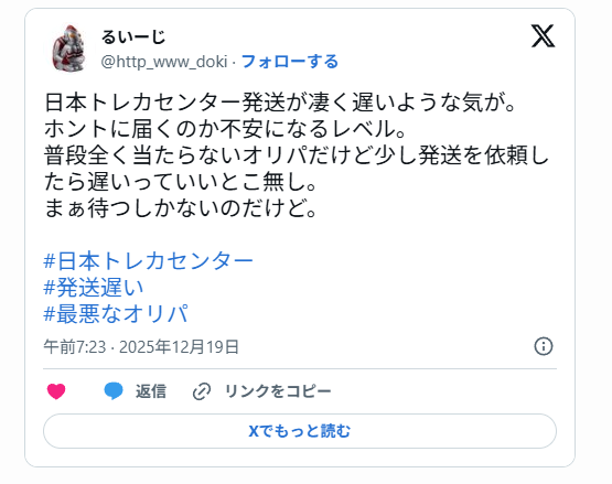 日本トレカセンターについては、Xなどで当選結果や発送対応、遊びやすさに関する投稿が多く見られます。